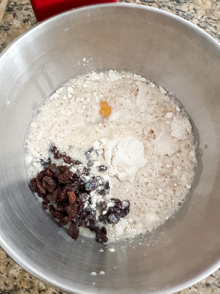 Fix your dough hook onto your stand mixer. In the mixer bowl, combine your flour, salt, eggs, and raisins.