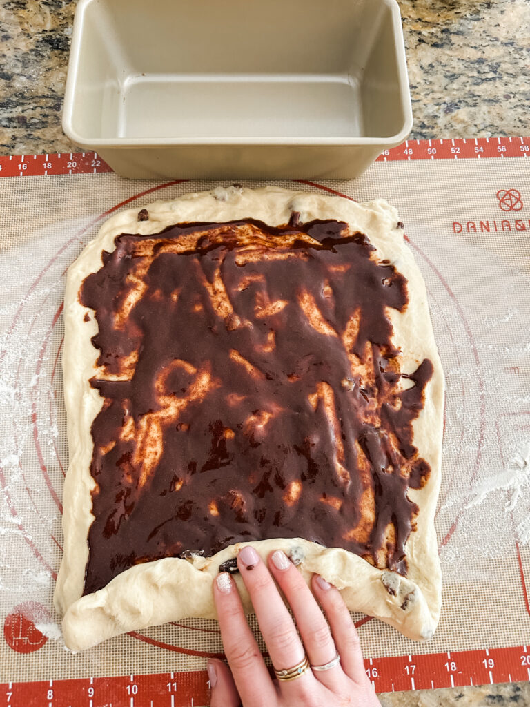 You are going to spread your dough out into a long rectangle, about the same length as your loaf pan. You can lightly flour your fingers or dip them in water to make it easier to work with the dough.