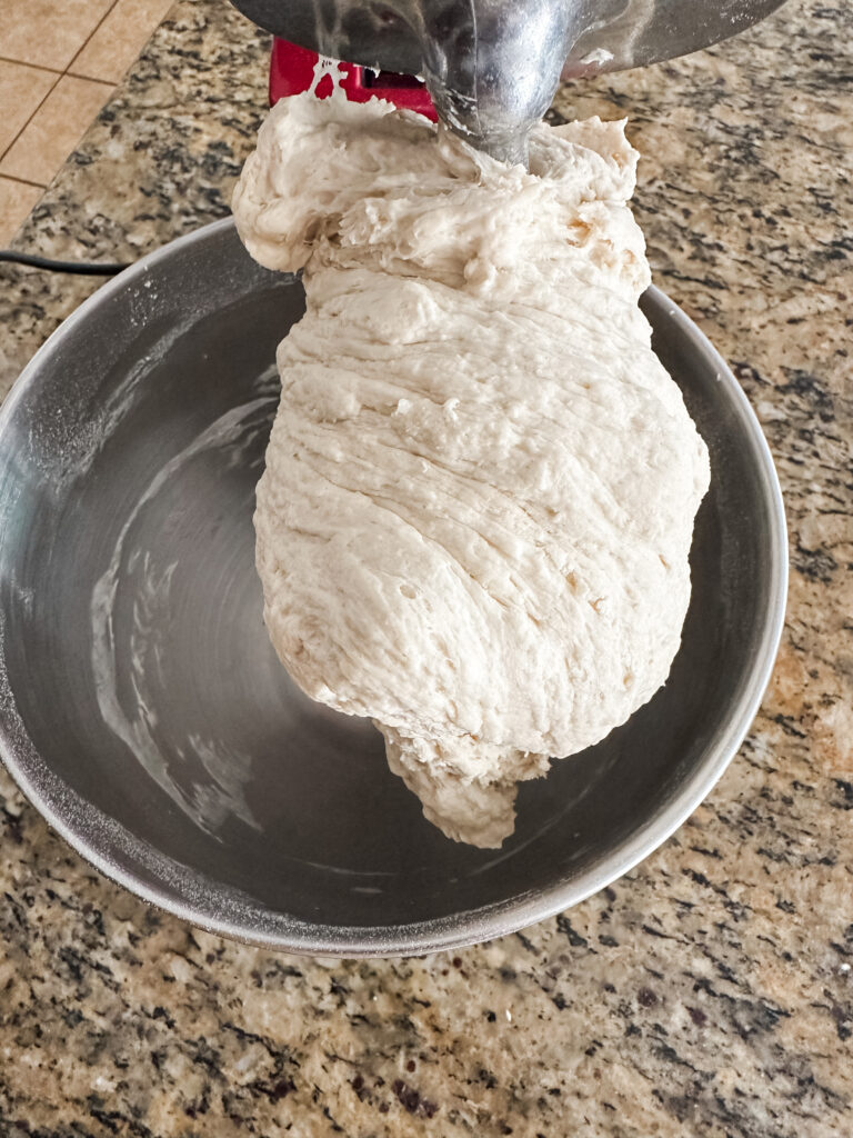 In your stand mixer bowl, add the flour and salt. Add your activated yeast and attach your dough hook. Knead until well combined. I usually start on the lowest speed for a couple of minutes, then bump it up one speed for 3-5 minutes.