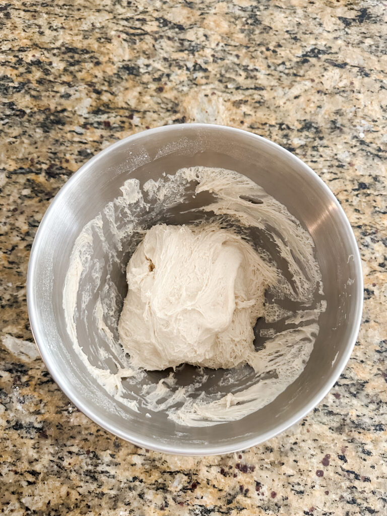After your dough has risen, you are going to do one round of stretch and folds. Scooping your fingers underneath your dough, you are going to “stretch” it upwards, and then “fold” it into the center. Do this all the way around your dough.