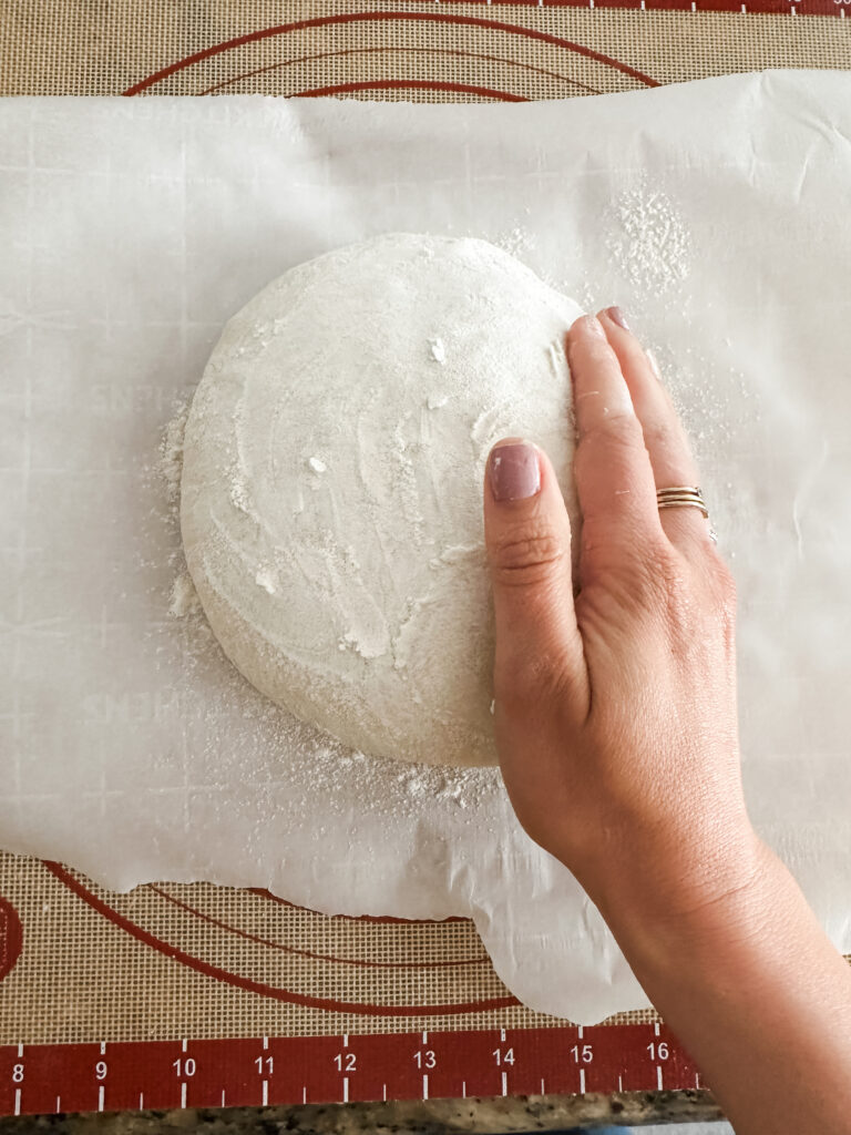 - With lightly floured hands, shape dough into a ball by pulling the edges into the center, and placing it seams down.