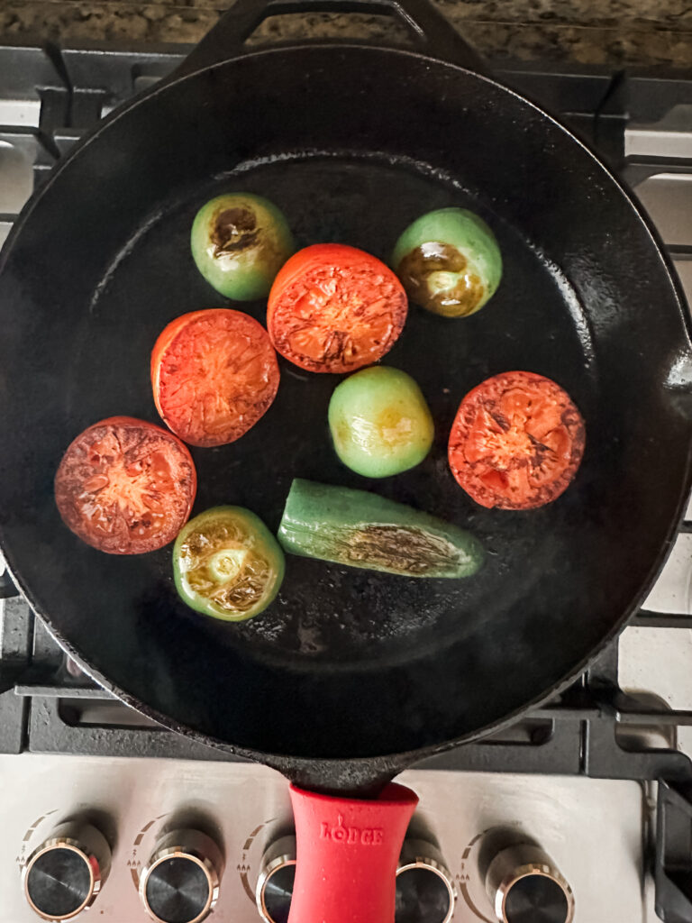Toss your tomatoes, tomatillos, jalapeno and garlic in a small drizzle of olive oil, and then add them to the pan. You’re going to roast these, turning occasionally, until they have a nice char on all sides. The garlic will char pretty quickly, and you don’t want it to turn bitter, so make sure to watch the garlic and pull it from the pan as soon as it’s nicely browned on all sides.