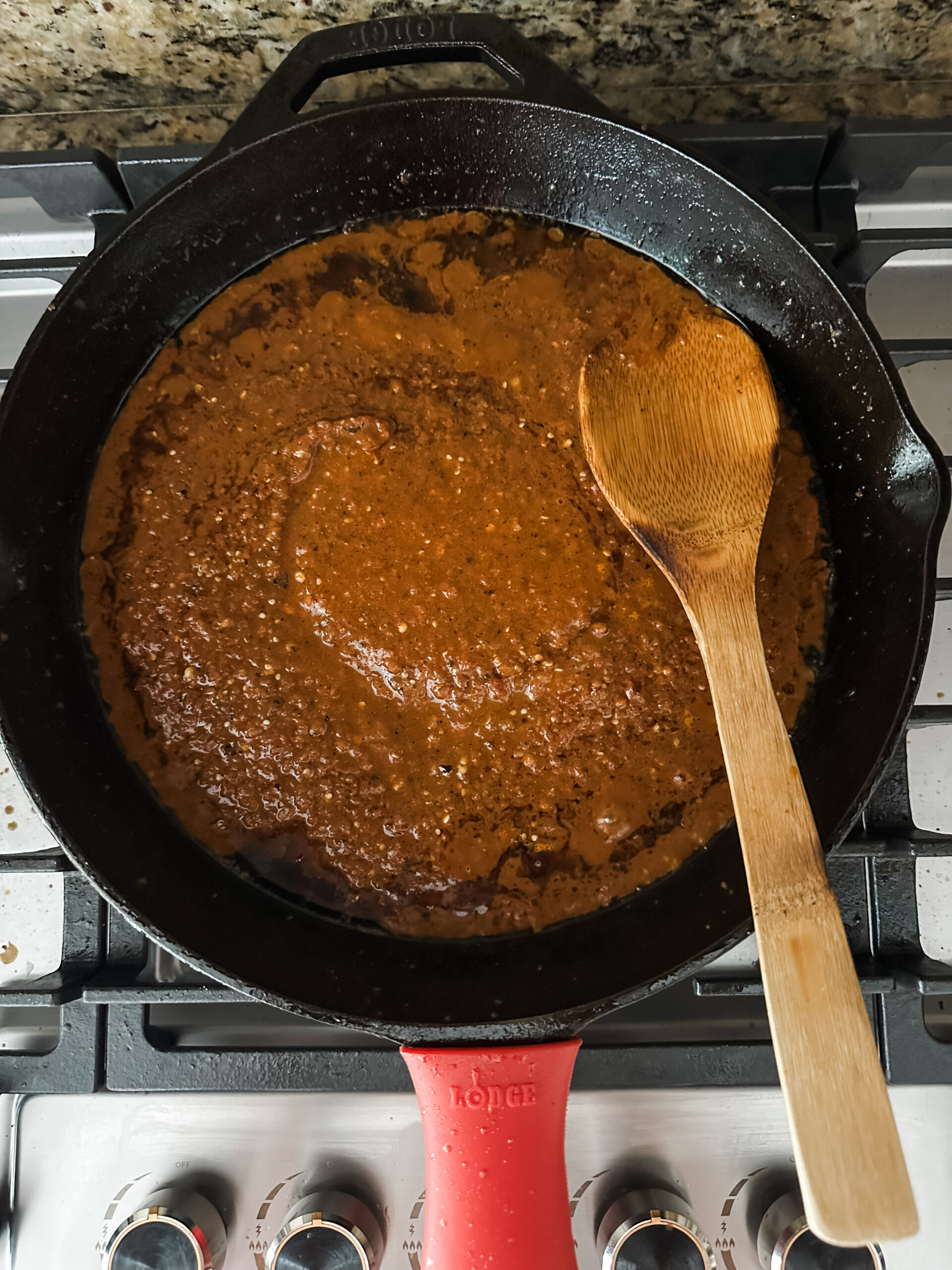 Once those have been full mixed into the salsa, your going to start heating the cast iron pan on medium heat. Add 2 tbsp on olive oil and then add the salsa, slowing stirring until the oil mixes into it.